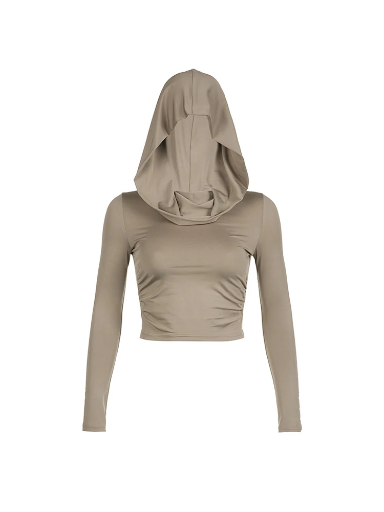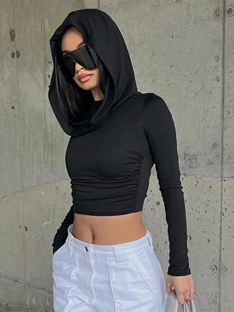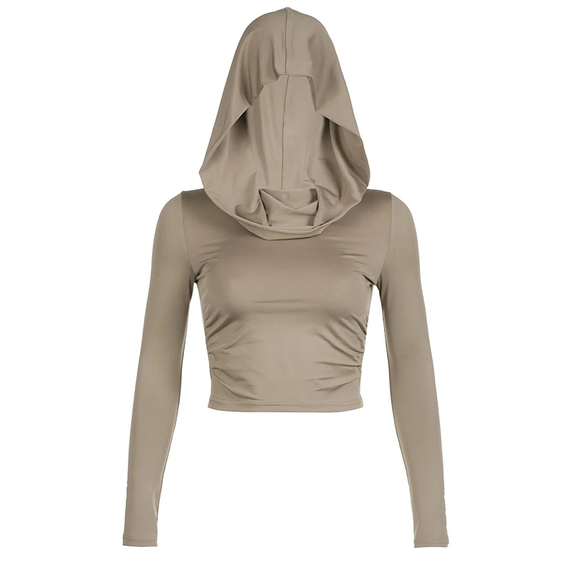 A sleek hooded crop top with a cowl neck and slim-fit long sleeves. Sporty, minimal, and versatile — pairs great with high-waist trousers, jeans, or skirts.