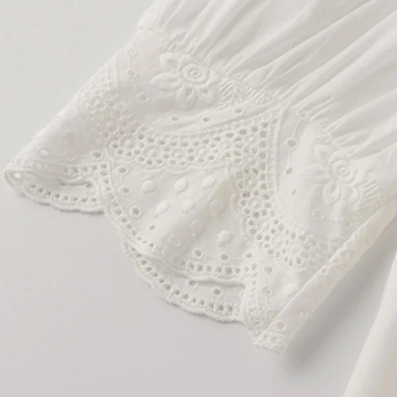 A beautifully crafted lace blouse with embroidered hollow-out detailing and short half sleeves. Vintage-inspired, effortlessly elegant, and timeless in white. Sizes S–XL.